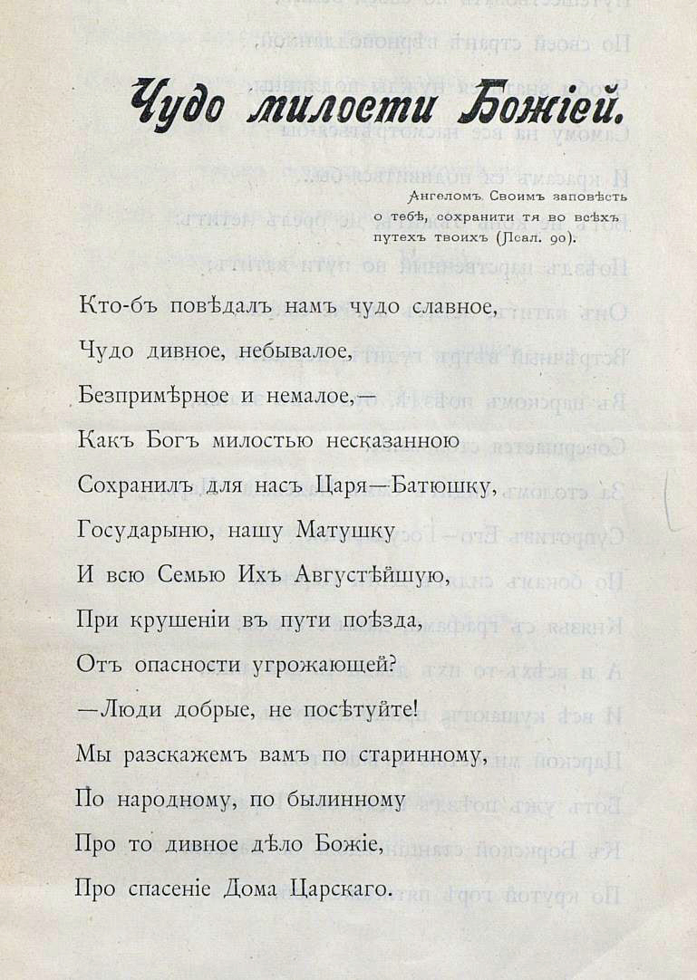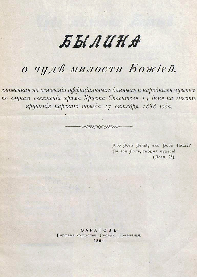 «Чудо милости Божией». 1888−17-X Путешествие их имп. величеств на юг России и дивное спасение государя имп. Александра Александровича, супруги его государыни имп. Марии Феодоровны и августейшего их семейства при крушении царского поезда 17 окт. 1888 года