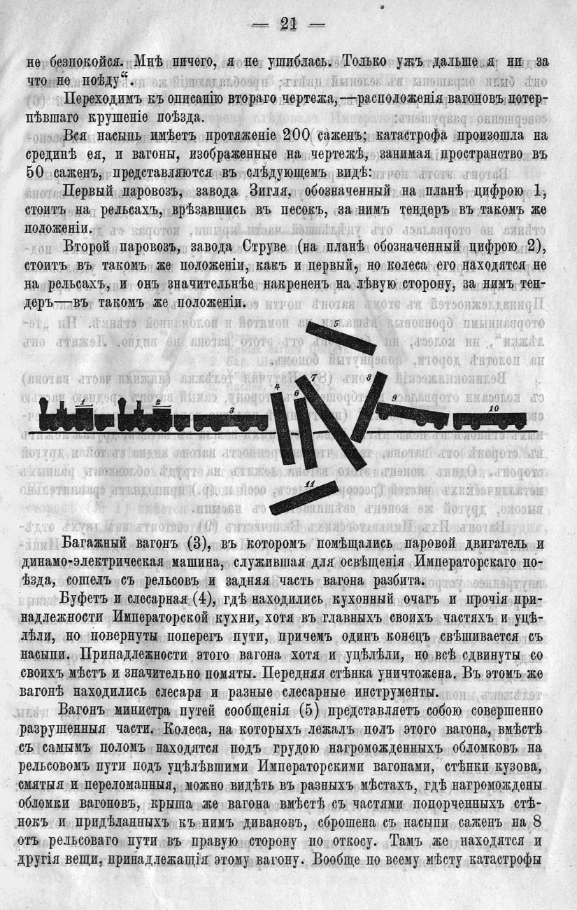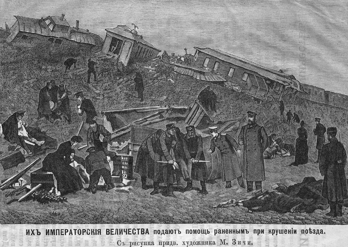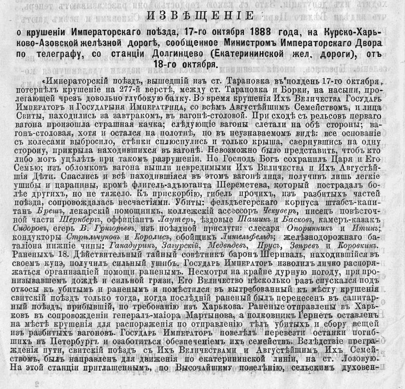 «Императорский поезд, вышедший изъ ст. Тарановка въ полдень 17-го октября, потерпел крушенiе на 277-й версте, между ст. Тарановка и Борки, на насыпи, пролегающей чрезъ довольно глубокую балку. Во время крушения Ихъ Величества Государь Императоръ и Государыня Императрица, со всемъ Августейшимъ Семействомъ, и лица Свиты, находились за завтракомъ, въ вагоне-столовой…»